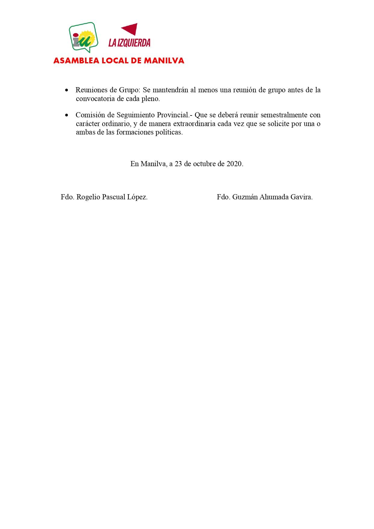 Según el comunicado de Izquierda Unida «Para tratar de evitar un nuevo escándalo para Manilva, llevamos casi 4 meses en conversaciones con el PSOE, tanto a nivel provincial, como a nivel local, y ofreciéndole incluso la Alcaldía a pesar de haber sido el tercer partido más votado en las últimas elecciones. Os adelantamos el borrador de Acuerdo que Izquierda Unida ha presentado al PSOE.»