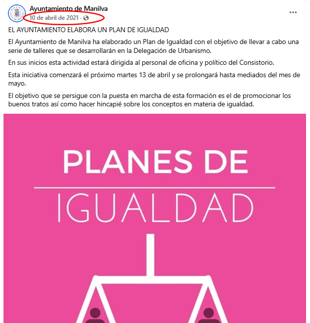 “El Ayuntamiento de Manilva ha elaborado un Plan de Igualdad”. Según ese comunicado, dicho plan serviría de base para la realización de talleres dirigidos al personal municipal entre abril y mayo de ese mismo año con el objetivo de promover los buenos tratos y reforzar los conceptos relacionados con la igualdad dentro de la administración local.