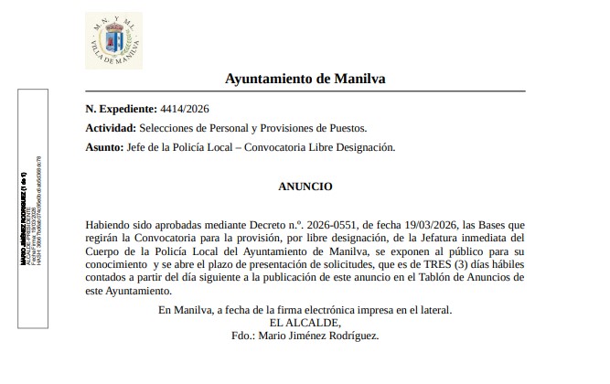 El Ayuntamiento de Manilva ha abierto hoy, 19 de marzo de 2026, una convocatoria pública para cubrir la jefatura de la Policía Local mediante el sistema de libre designación, tras la aprobación de las bases por decreto de Alcaldía.